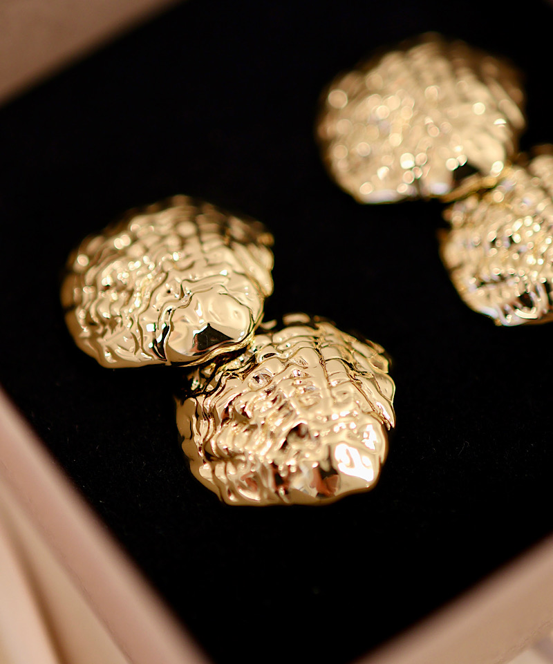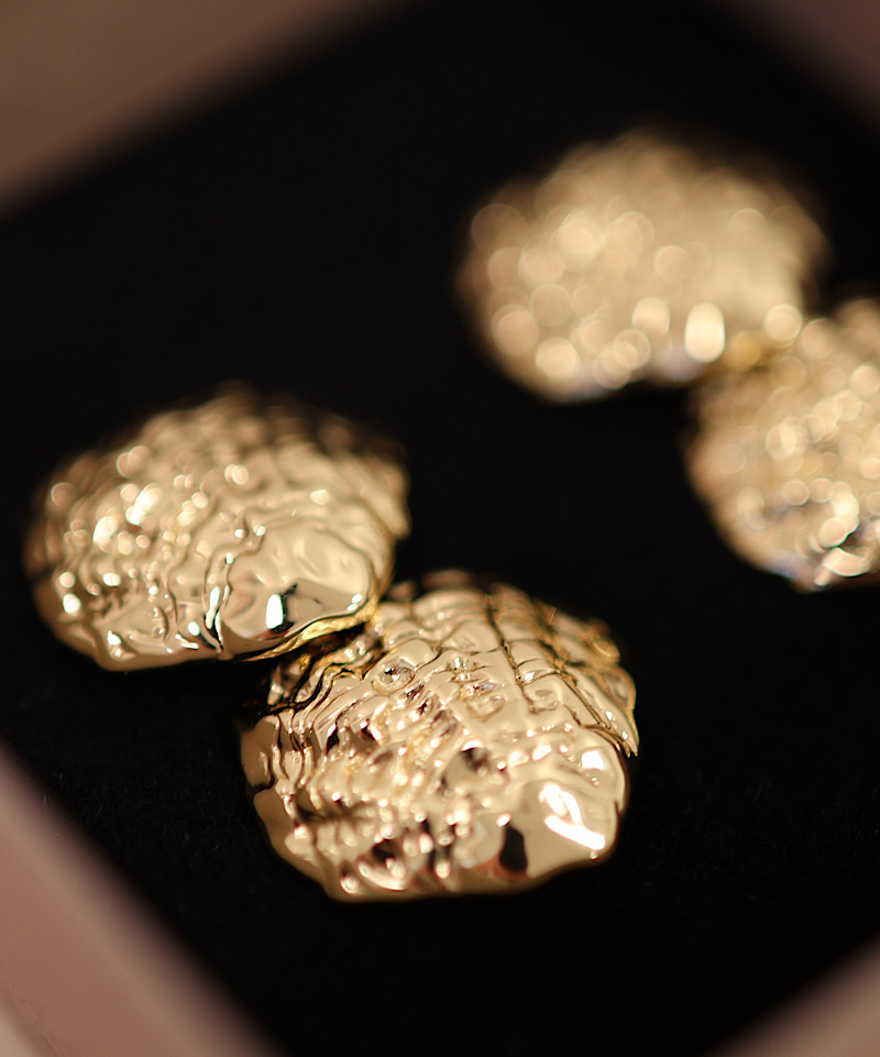 Alle mine smykker er belagt med 18 karat guld over to omgange, hvilket giver en smuk og holdbar finish. Basismaterialet er massivt messing, som jeg nøje har valgt på grund af dets unikke egenskaber: det er antibakterielt, holdbart og allergivenligt. Styrken i messing, gør det muligt at lave nogle skarpe og smukke detaljer i hvert smykke.